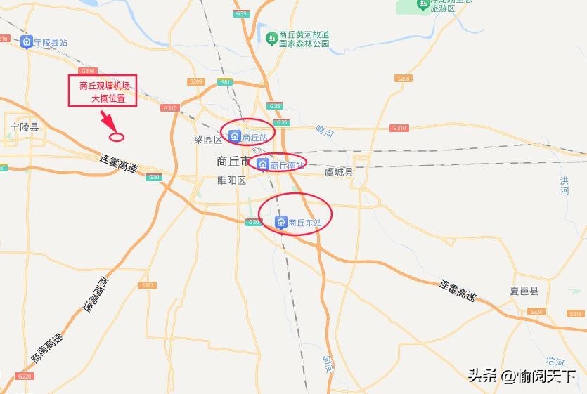 7.商丘城区西南部或观堂机场附近设站:商丘市城区已有商丘站、商丘南站、商丘东站。作为城际铁路站,选在城区的西南部或西部更加合理,因为这两个区域目前还没有火车站、高铁站,商丘市毕竟是地级城市,也是重要的铁路枢纽城市,均衡布局高铁站更加合理。如果在观堂机场附近设站,还可以实现陆空联运。