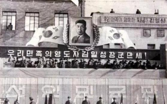 1948年2月朝鲜人民军成立典礼上,悬挂于金日成像两侧的太极旗(图片来源:维基百科)