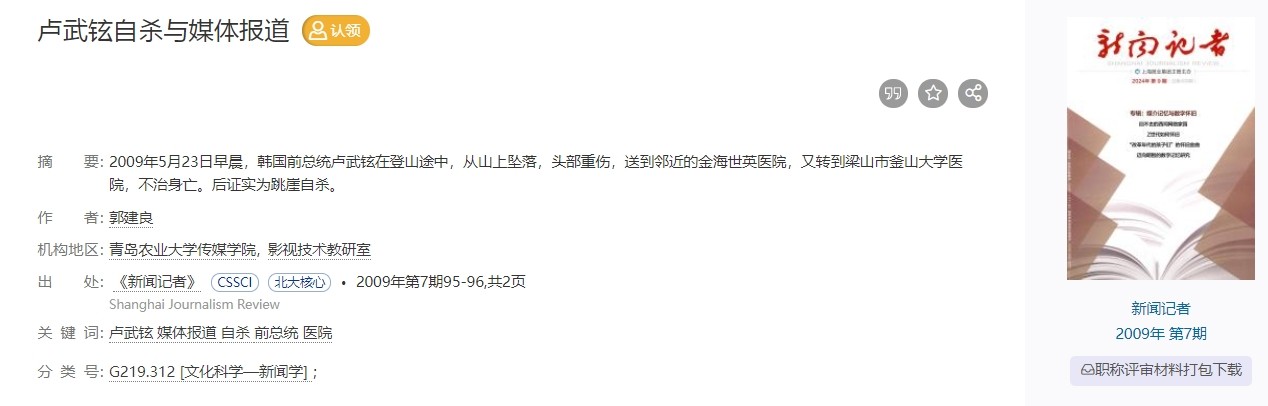 2、卢武铉自杀与媒体报道——《新闻记者》 2009年第7期95-96,共2页