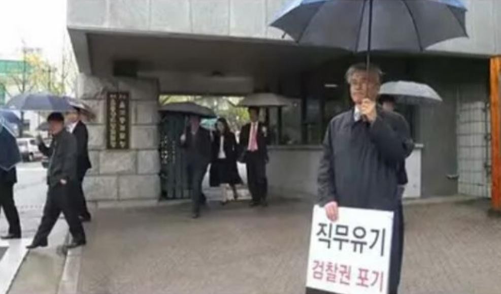 卢武铉死后,文在寅独自一人在首尔瑞草洞中央地方检察院正前进行示威。