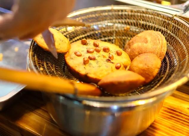 芋头粿外酥脆内软嫩,口感相当独特。其做法是,将槟榔芋切成细丝状,加入面浆调和,滴入红花调色;再将面浆舀入专门炸芋头粿的铲子上,放入油锅中炸至色泽鲜艳即成。