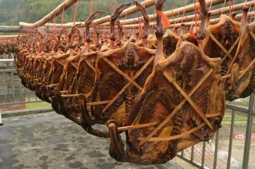 沙县郑湖乡村民们沿用传统做法,将鲜鸭用小竹条撑开成板状,放在户外自然风干或晒干,再放进地炉用木炭烤脱水,便制作出了板鸭。