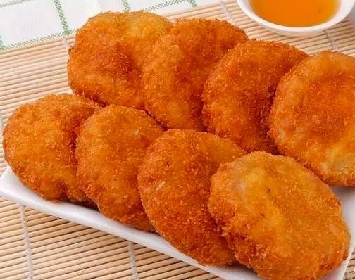 红芽香芋煮熟后碾成泥,加入白糖、木薯粉、面粉搅拌均匀,做成饼状,再放到面包糠里滚炸至两面呈金黄色。