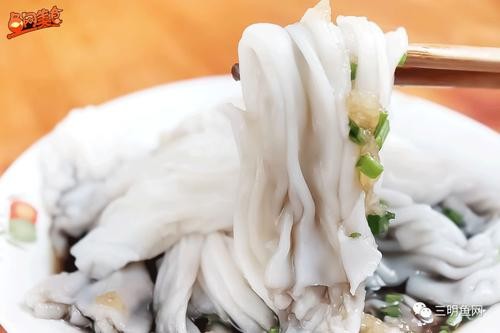 米冻皮外形酷似粤菜肠粉,口感也相似,具有天然大米香,吃起来爽滑。沙县人做米冻,水烧开后,把籼米米浆徐徐倒入,一边不停搅拌画圈。米浆写均匀后,倒入炊具,猛火蒸熟,冷却即可食用。