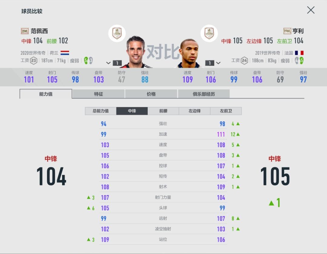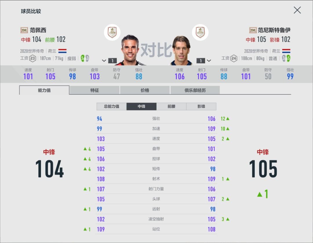目前游戏中的范佩西除了20WL之外,常见的就是NHD范佩西了,直接对比属性的话,我们会发现20WL范佩西单卡属性和NHD范佩西10卡差不多,算上金卡/银卡军团加成,N卡的话,也要9卡才能和20WL有一战之力。