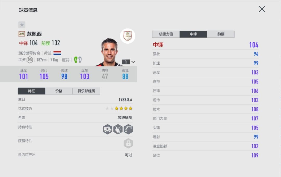 范佩西此前在游戏中稍显尴尬,他没有特别强壮的身体,射术和头球也不是最顶级,他的特点是全面和均衡,虽然没有特别突出的数值,但是也没有很明显的短板,这种类型的球员,至少可以保证下限不会太低,无论何种情况下,他们都能做出稳定的贡献。