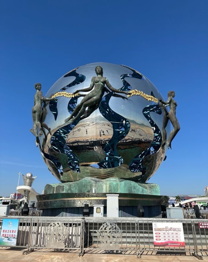 北海银滩除了独一无二的沙滩特色,还有一个标志性的地标建筑,即亚洲第一钢塑“潮”,整座雕塑以象征一颗大明珠的球体和七位裸体少女护卫球为主体,非常壮观。