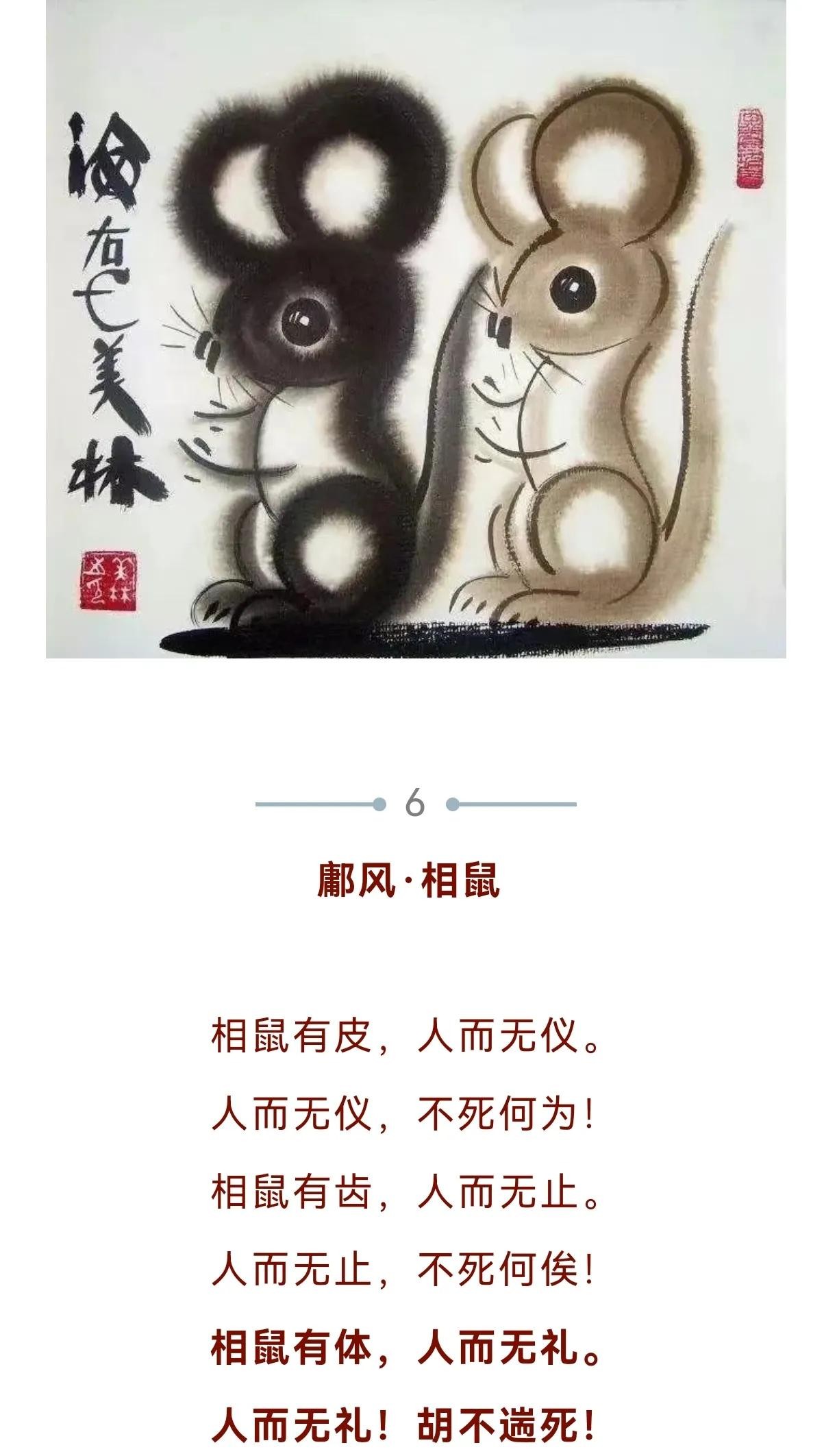 《鄘风·相鼠》以鼠喻人,痛斥那些无仪、无止、无礼之人。“相鼠有皮,人而无仪。人而无仪,不死何为!”老鼠尚有皮,人却毫无礼仪,这样的人为何还不去死?言辞激烈,毫不留情,将对无德之人的痛恨表达得淋漓尽致。