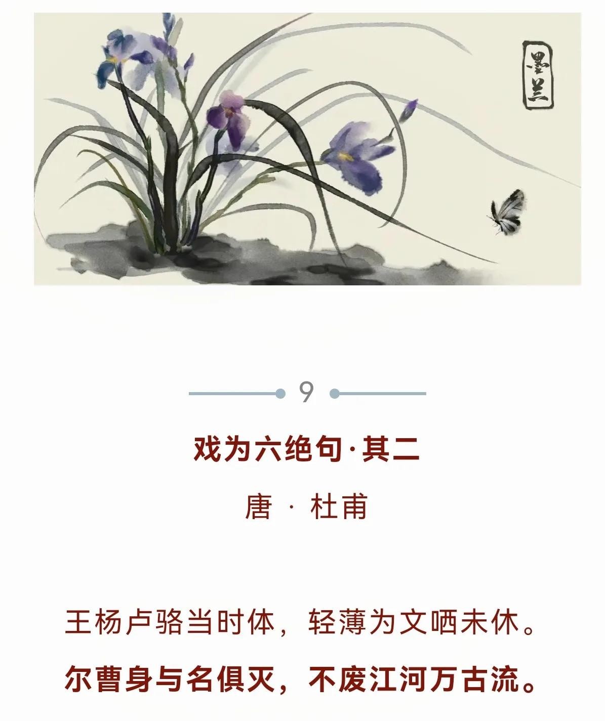 杜甫的《戏为六绝句·其二》针对当时轻薄文人对初唐四杰的诋毁予以有力回击。“尔曹身与名俱灭,不废江河万古流”,这一句犹如当头棒喝,让那些自以为是的文人清醒地认识到,自己的浅薄终将被历史淘汰,而真正的才华是不会被磨灭的。