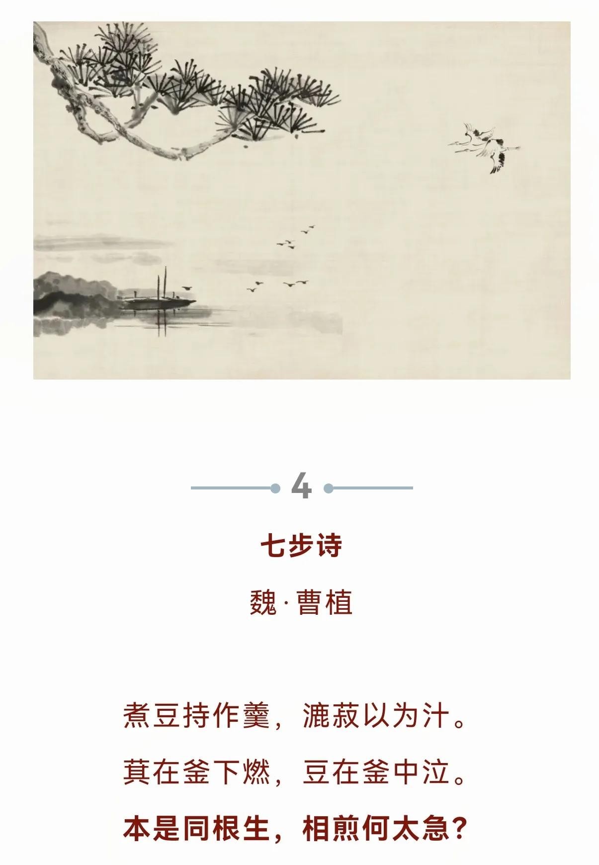 曹植的《七步诗》更是家喻户晓。“煮豆持作羹,漉菽以为汁。萁在釜下燃,豆在釜中泣。本是同根生,相煎何太急?”用同根而生的豆和萁来比喻兄弟,将兄弟相残的悲痛与无奈展现得淋漓尽致,同时也是对曹丕不顾手足之情的强烈指责。