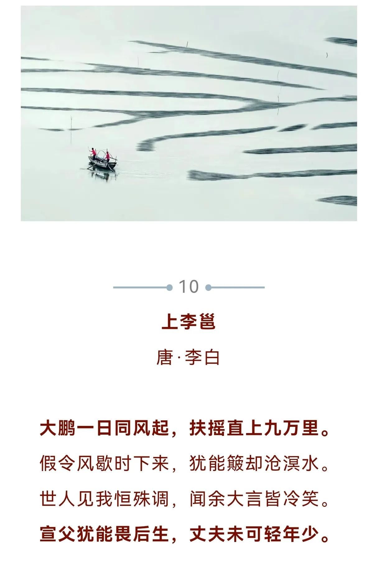 李白的《上李邕》展现了他的壮志豪情与对轻视的不屑。“世人见我恒殊调,闻余大言皆冷笑。宣父犹能畏后生,丈夫未可轻年少。”李白以豪迈之姿回应那些嘲笑他的人,告诉世人莫要轻视年轻人的志向与抱负。