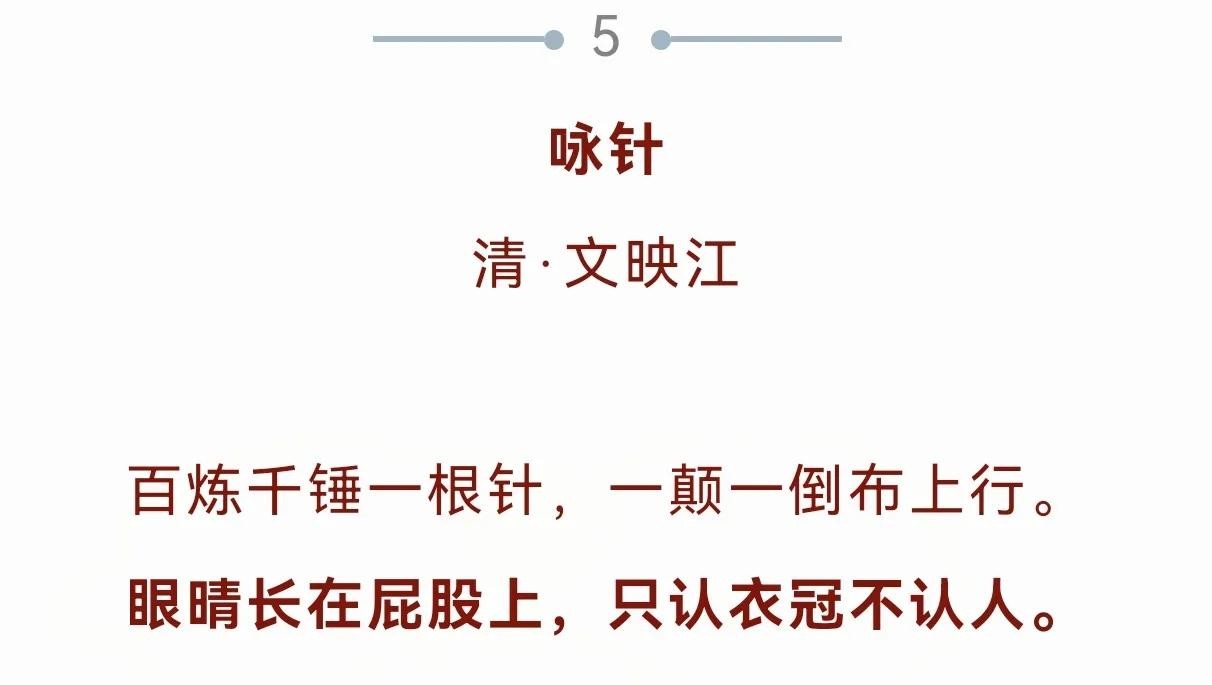 清代文映江的《咏针》,“百炼千锤一根针,一颠一倒布上行。眼晴长在屁股上,只认衣冠不认人。”以针的形象讽刺那些趋炎附势、只看外表不看内在的人,一针见血,让人忍俊不禁的同时又陷入深思。