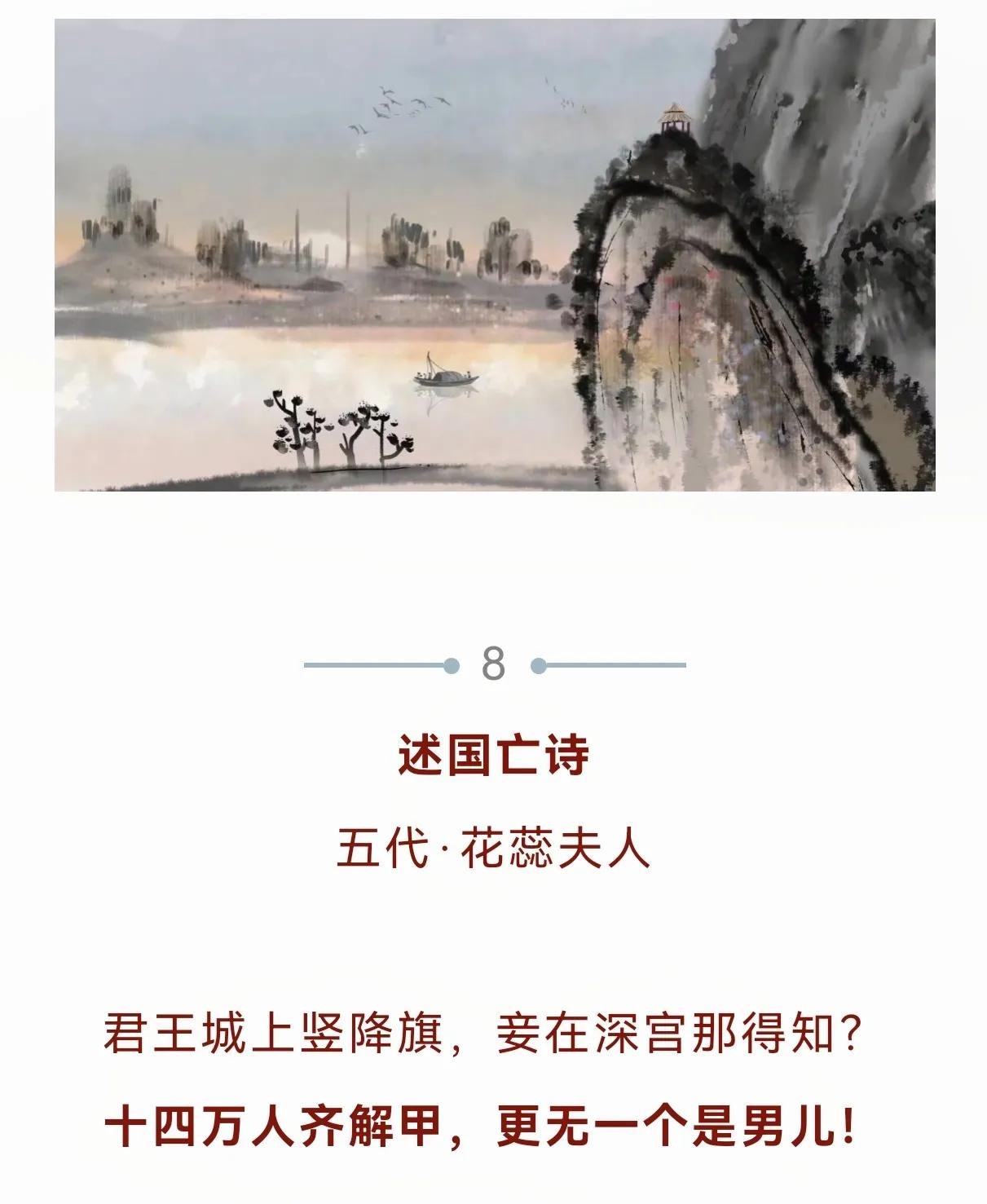 五代花蕊夫人的《述国亡诗》更是巾帼不让须眉,痛斥了投降的懦弱行径。“十四万人齐解甲,更无一个是男儿!”在国家危亡之际,十四万士兵竟然不战而降,诗人以女子之口,发出如此振聋发聩的质问,其愤慨之情溢于言表,将那些毫无骨气的男儿骂得狗血喷头。