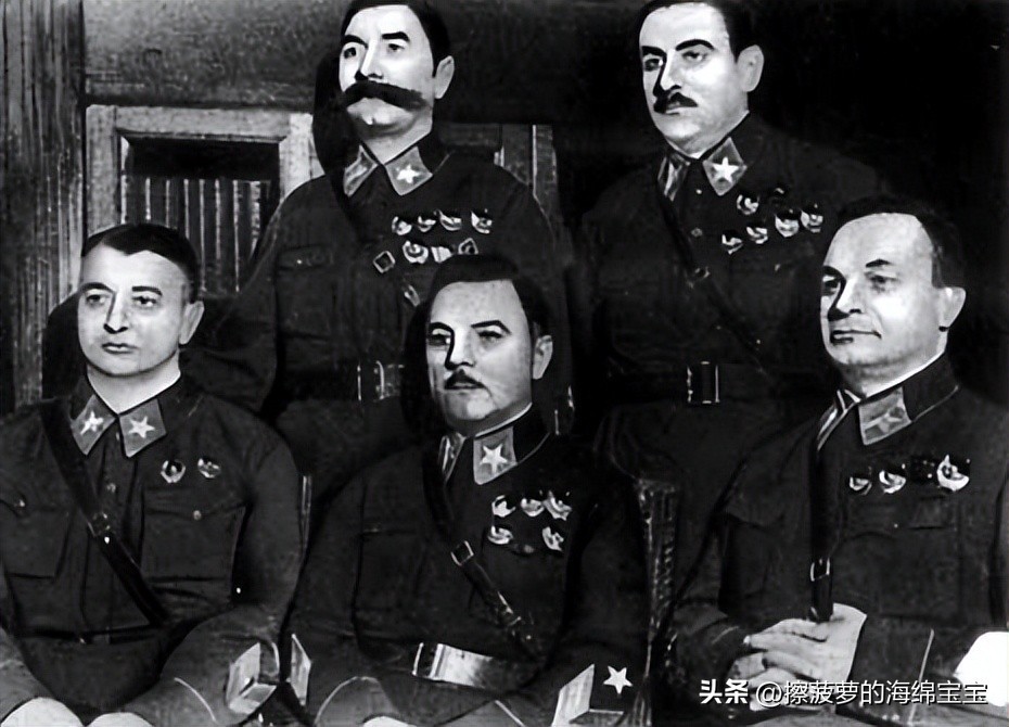 从左到右,站着两位:布琼尼和布柳赫尔,坐着三位图哈切夫斯基,伏罗希洛夫和叶戈罗夫
