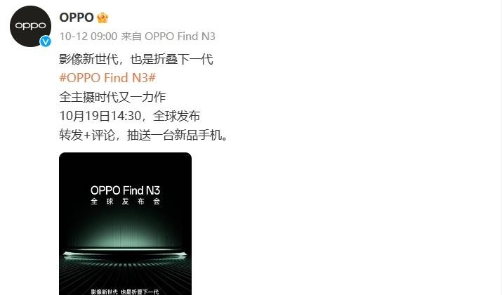 OPPO官方还宣布了OPPO Find N3折叠屏手机将于10月19日发布,