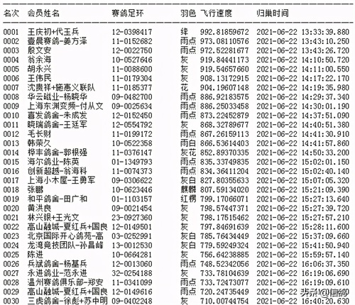 以下为前三十位归巢数据,仅供参考,最终排名,以官网最终排名为准。