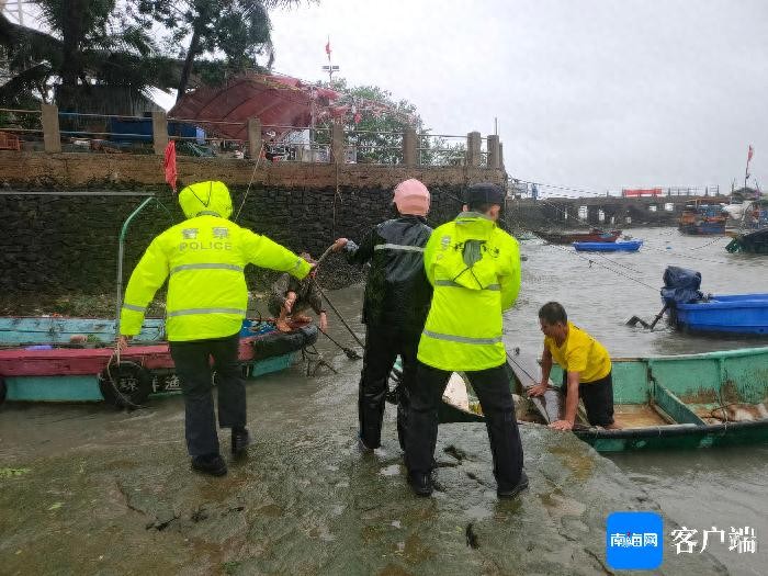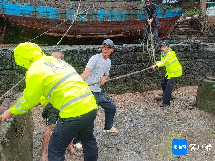 第七支队民警帮忙渔民将渔船收拢靠岸,停港避风。海南省海岸警察第七支队供图