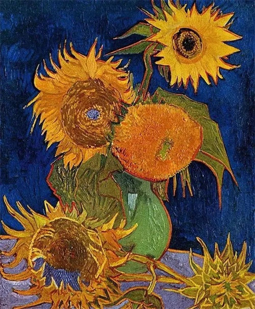 他善于运用鲜艳的色彩,来表现自己内心的情感世界。在梵高看来,向日葵是最能展现色彩魅力的花卉。他曾说:“向日葵是我最喜欢的颜色,黄色代表着阳光、希望和快乐。”。在梵高的向日葵画作中,我们可以看到金黄色的花瓣、深蓝色的背景以及翠绿的叶子,这些色彩的碰撞和交融,让画面充满了强烈的视觉冲击力。
