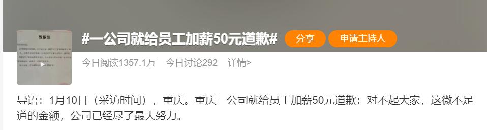 重庆一公司就给员工加薪 50 元道歉: