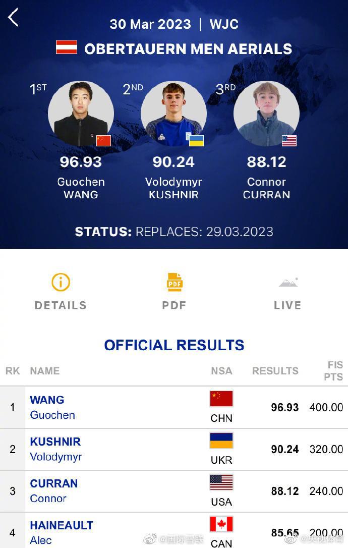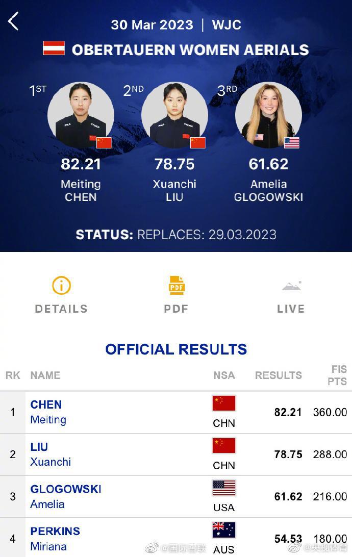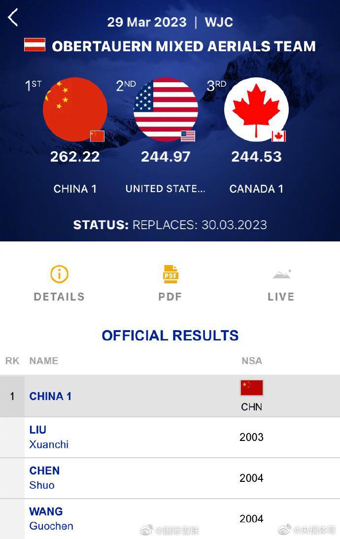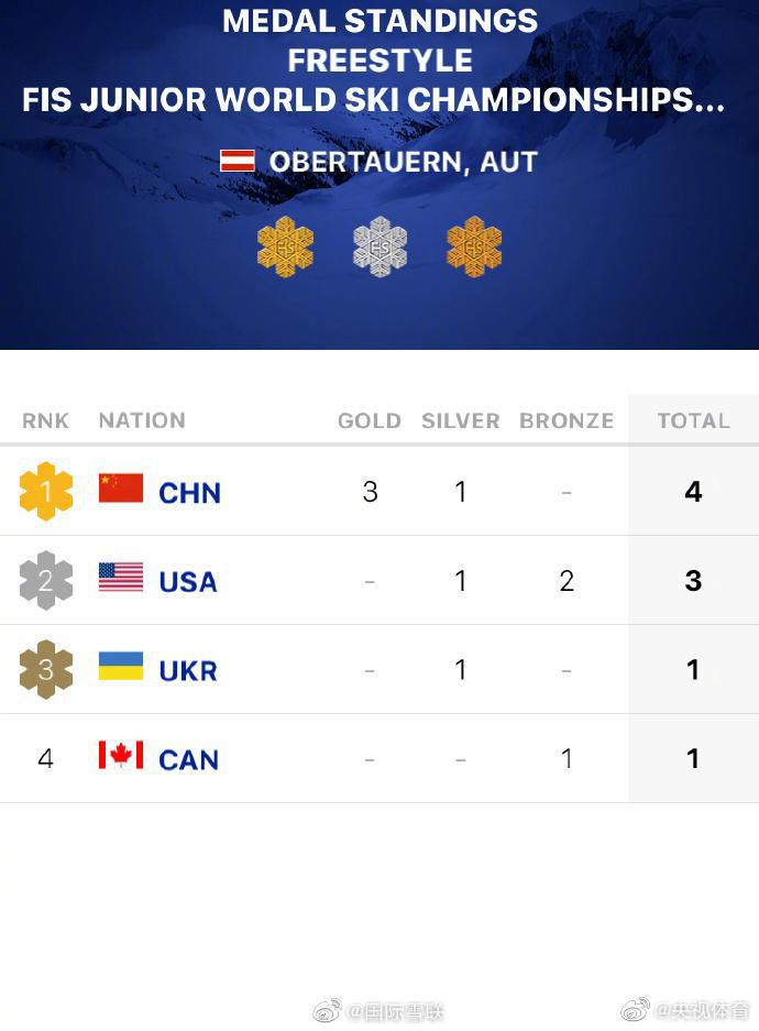 据 @国际雪联 3 月 31 日消息,在奥地利进行的 2023 年世界青年自由式滑雪空中技巧锦标赛中,中国运动员发挥出色,包揽了全部三个项目的金牌!