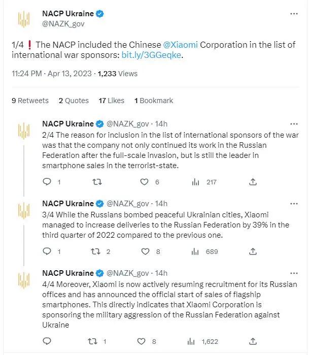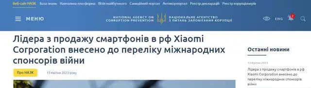 当地时间 4 月 13 日,乌克兰国家预防腐败局发布公告,将小米公司列入所谓 " 战争赞助商 " 名单,进而施加制裁。