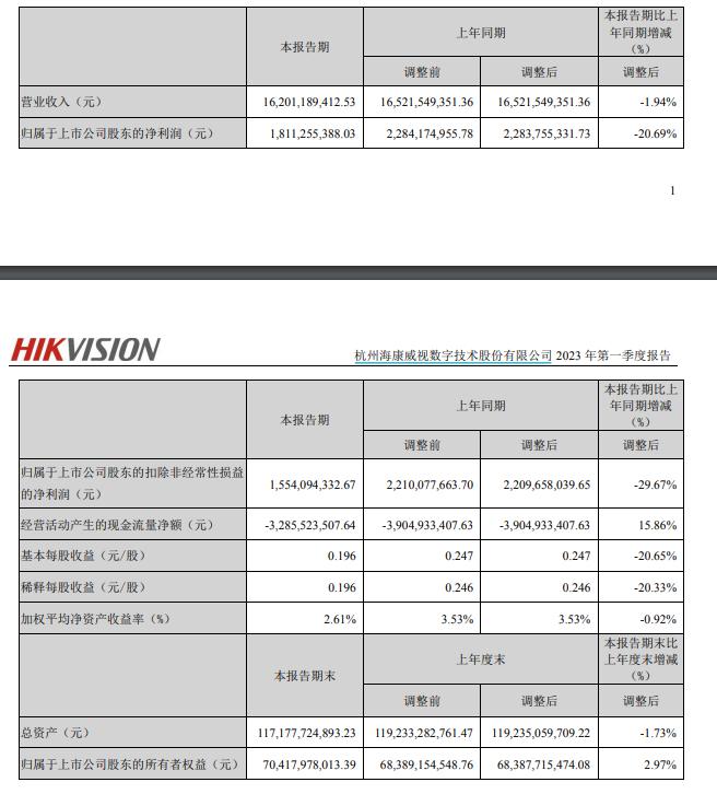 2023 年第一季度,海康威视营业收入 162.01 亿元,同比下滑 1.94%;净利润 18.11 亿元,同比下滑 20.69%。