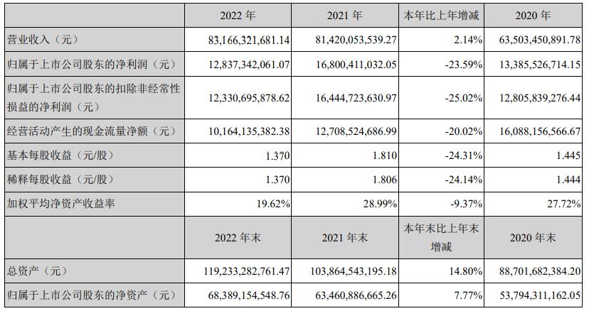 4 月 14 日晚间,海康威视披露 2022 年年度报告以及 2023 年第一季度报告。2022 年,海康威视实现营业收入 831.66 亿元,同比增长 2.14%;净利润 128.37 亿元,同比下滑 23.59%;每股收益 1.37 元。