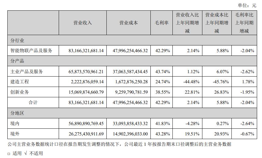 具体而言,海康威视创新业务营收为 150.7 亿元,同比增长 22.81%,主业产品及服务营收 658.74 亿元,同比微增 1.12%,而建造工程营收则仅有 22.23 亿元,同比暴跌 44.48%。