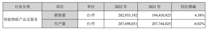 智能物联产品及服务 2022 年销售量同比增长 4.38%,生产量同比略减 0.02%。