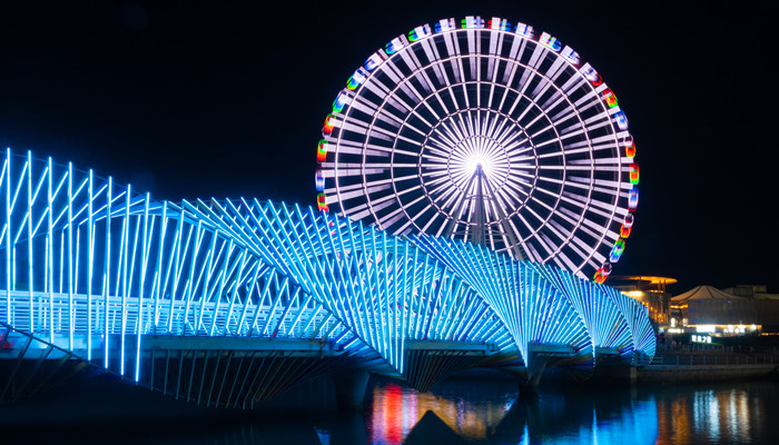 我国南昌之星摩天轮,现为世界第三高,国内第一高的摩天轮,该摩天轮总高程为160米,转盘直径为153米。摩天轮的轮面彩灯由六七千根led半导体照明器件构成,全部亮灯后除了可以显示一座直径为153米的巨型彩色时钟,还可根据需要设定不同图案,目前,彩灯系统已经预设了15套节目;另外,市民还可发送手机短信到控制系统,摩天轮的彩灯即可显示短信内容,字数只要在12个之内即可。