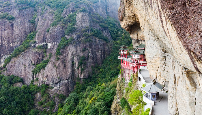 这里山势陡峻,两边是直立百余米、如同斧劈刀削一般的悬崖,悬空寺就建在这悬崖上,或者说像是粘贴的悬崖上似的,真有凌空欲飞之势,惊险奇特,别具一格。远远望去,只见神楼仙宫,凌空危挂。丹廊朱户,傍崖飞栖,仿佛是玲珑的雕刻镶嵌在万仞峭壁间。游人登临,钻天窗,穿石窟,跨栈道,步长廊,如临仙境。这些建筑都集中一个凹进的庞大崖龛里,每逢暴雨倾盆,雨水从寺顶突出的岩头上飞流直下,泻入谷底,便给这琼楼仙阁挂上了一排排晶莹的水帘,蔚为奇观。给人一种可望而不可即的感觉。