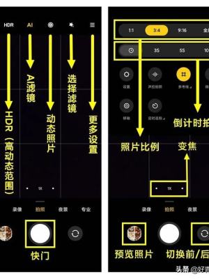 闪光灯,可以切换关闭、自动、强制打开、常亮四种状态,可用于照亮有限距离的物体。HDR(高动态在哪范围),可以设置关闭、自动、强制打开三种状态,可用于优化明暗比较大场景,例如画面中有强烈光照外加较暗的阴影。AI滤镜,MIUI特色功能,会根据拍摄场景自动添加滤镜,比如日出、天空、花朵、宠物、人像、夜景、建筑、美食等等几十种场景,日常使用建议打开,对成片效果提升明显。动态照片,打开后每次拍照可录制1秒钟的短视频,后期可以在这1秒钟内保存任意一帧照片,适合抓拍时提供更多备选照片。选择滤镜,打开后可以直接在拍照界面选择约20种滤镜,效果实时可见,这部分滤镜也可以在拍照后,在相册中编辑照片时再次选取。更多设置按钮,点击后如右图,会展开更多设置选项。