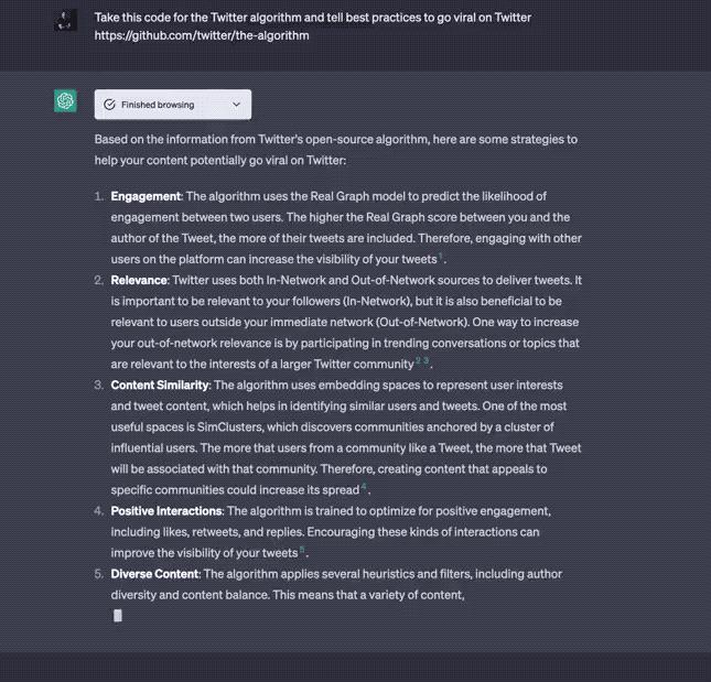 4. 分析 Twitter 的开源算法代码。使用 Twitter 的算法代码,ChatGPT 现在可以告诉你如何在 Twitter 上爆火。