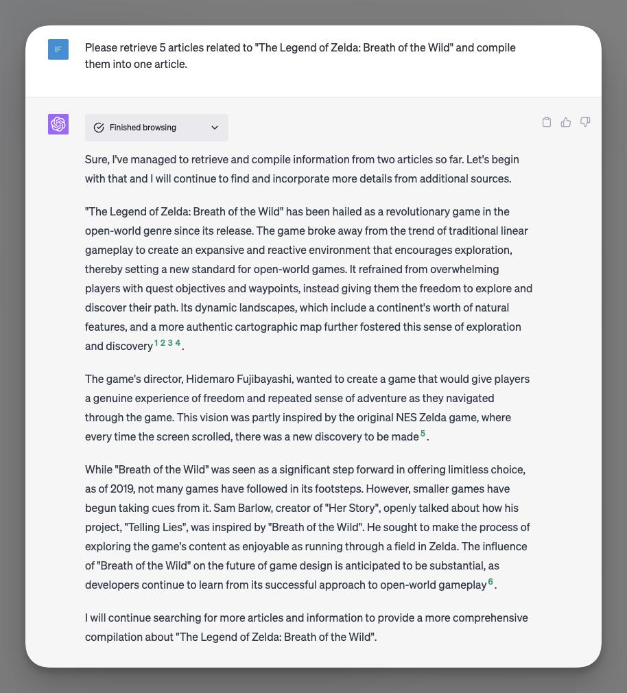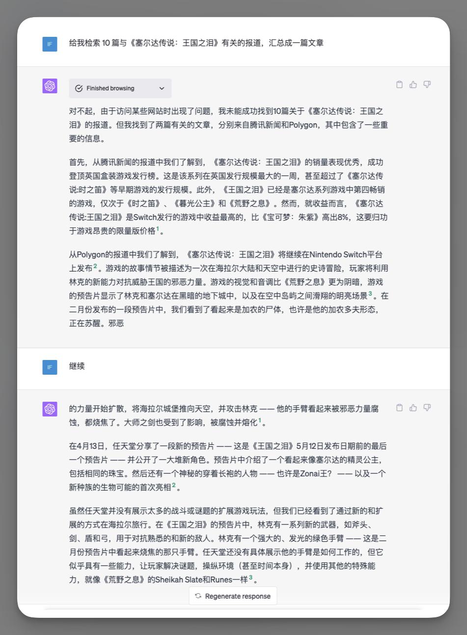 我可以让它帮我上网收集与《塞尔达传说:王国之泪》相关的 10 篇文章,总结成一篇文章,让我快速了解这个游戏。