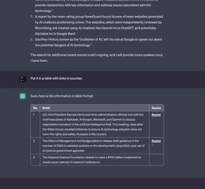 1. 找出最新的新闻并将其放入带有链接来源的表格。ChatGPT 现在可以总结所有最新的新闻并引用其来源。