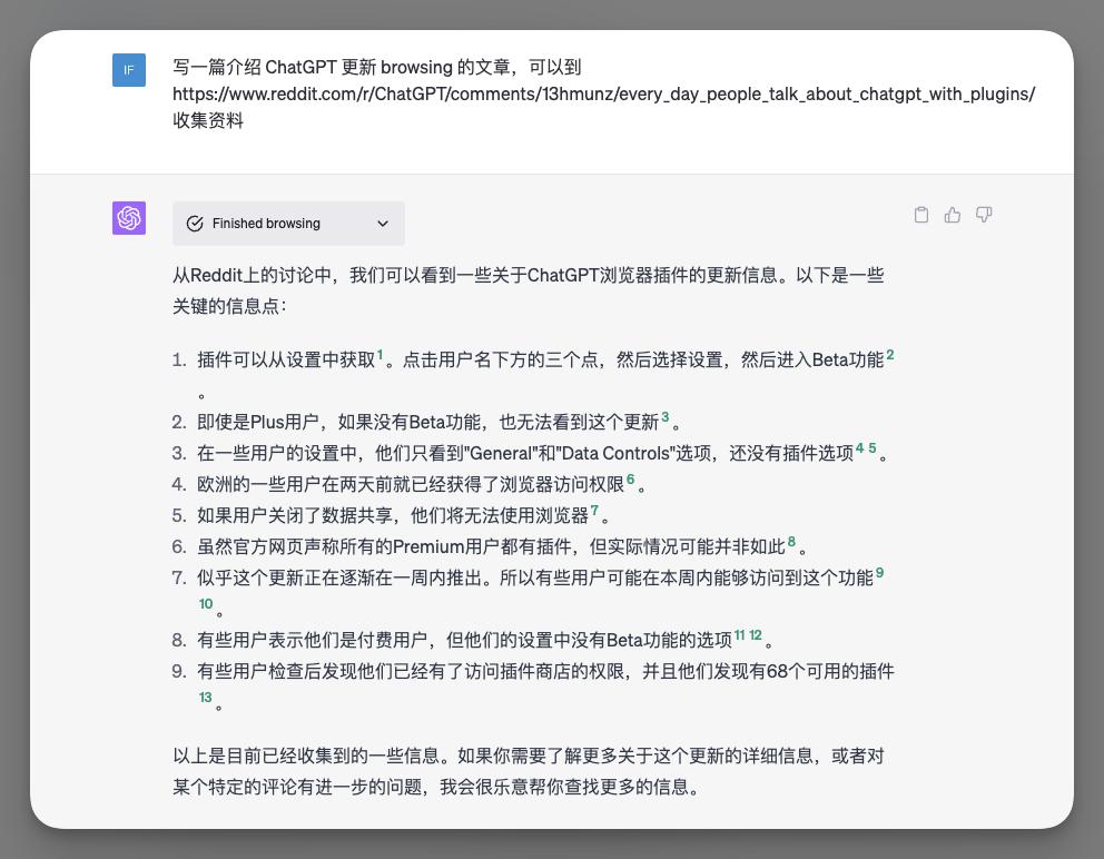 总结一下,ChatGPT 的 Browsing 模式确实给用户带来了新的搜索体验。它能更精确地找到你需要的内容,并且能根据网络上的资料快速生成你需要的信息。
