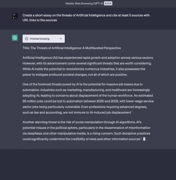 提示词:「对关于人工智能的威胁,写一篇短篇论文,并至少引用 5 个来源,附上 URL 链接到这些来源」。