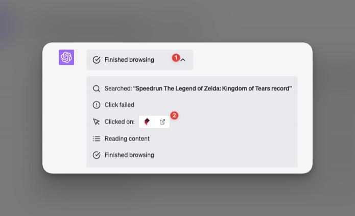 你还可以点开新增的小方框,详细地看到 ChatGPT 的检索过程:检索关键词、点开链接、阅读网页、思考,最后整套流程下来再回答。在这里还能看到它参考了哪些网站,给了用户很高的透明度。