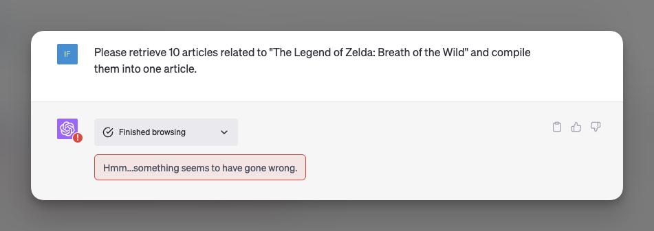 2. ChatGPT Browsing 检索网站时失败的几率很大,检索失败、宕机、吐不出字都是时有的事。