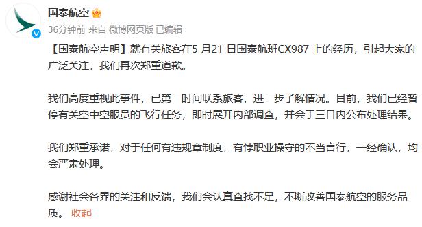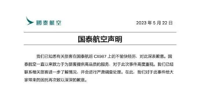 5 月 22 日晚,@国泰航空 发布声明:已知悉有关旅客在国泰航班 CX987 上的不愉快经历,对此深表歉意。国泰航空一直以来致力于为旅客提供高品质的服务,对于此次事件高度重视。我们已经联系相关旅客进一步了解情况,并会进行严肃调查处理。在此,我们对于此事件给大家带来的困扰再次致以深深的歉意。