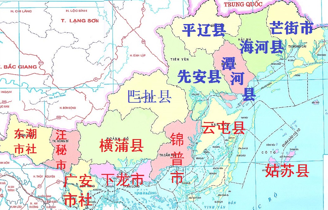 下面就是越南广宁省的行政区划地图,蓝色部分属于前海宁省、红色部分属于前广安省。