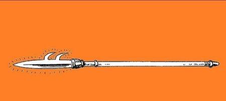 有利刃,还有两个倒钩,可以把人拉倒,然后就把刺进去。