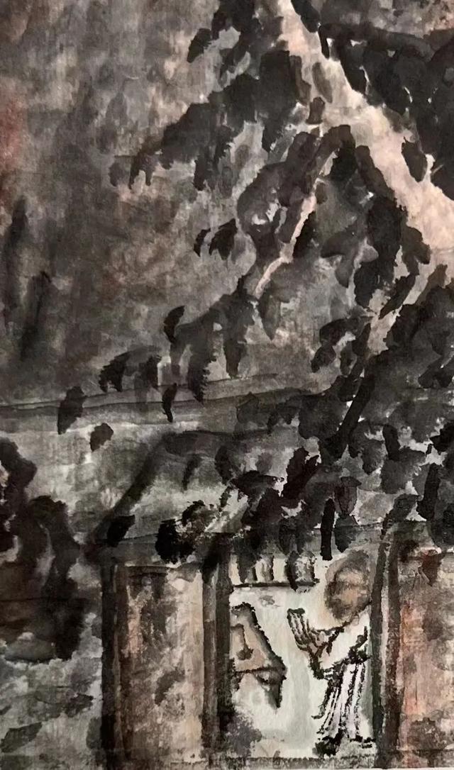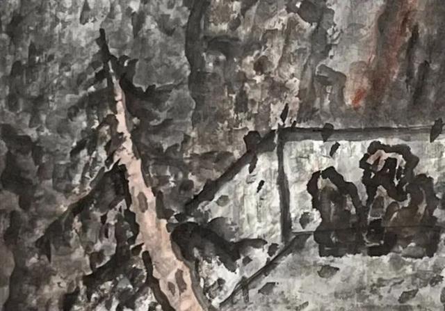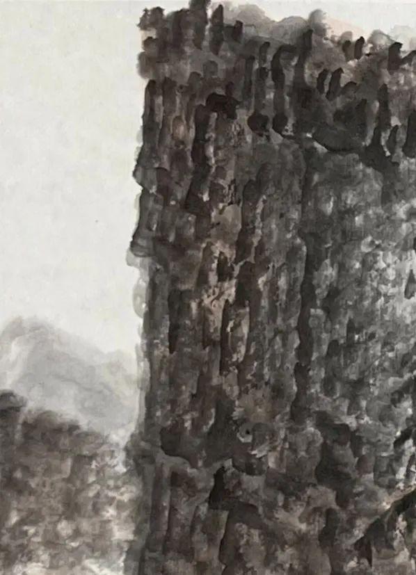 《虹庐读书图》中,刀削斧劈一般的大山色泽浓厚黑沉,稳稳矗立着,秩序重叠地排列着(图二)。大山的画法取法北宋的范宽,用笔强健有力,皴法如雨点、豆瓣。下笔均直简单,形如稻谷;下笔如凿,凿痕遍布山石。点笔时有聚有散,墨色有浓有淡,虚实相间。密密麻麻的雨点皴,黑沉沉的浓厚的墨韵,厚实而滋润超。用笔虽密集绘画作品却透气,仿佛有气在山间流动,气势壮阔伟岸,阴阳向背,营造出深远的空间感(图三),画作尺幅虽小,却因此有了宇宙空间之感。