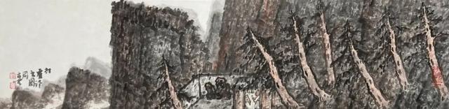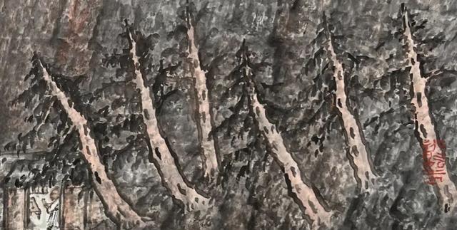 画中右侧树木三棵一组,向斜上方倔强地伸展着,有宁折不弯的气势,树干中透出一股坚韧的力量(图六), 远处的大山大刀阔斧地直线切割,笔直庄重地矗立,与那几棵歪斜生长的大树一对比,顿时稳住了画面的重心(图七)。