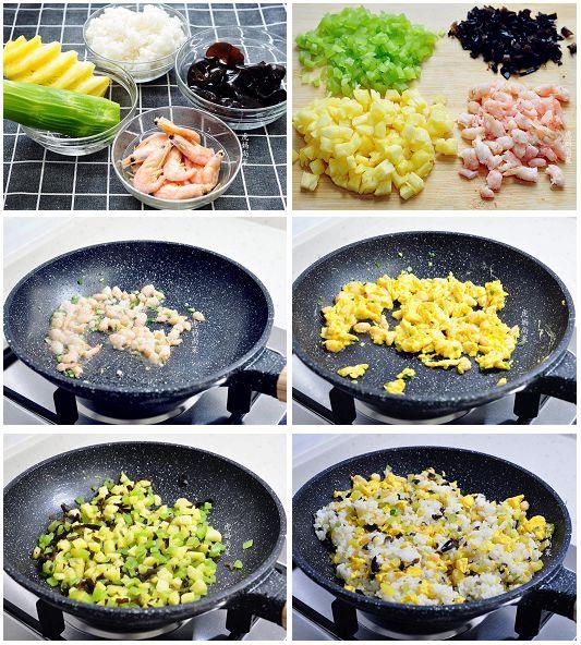 材料:米饭1碗,菠萝1/4个,莴笋1小段,北极甜虾14个,木耳30克,鸡蛋2个,盐少许。