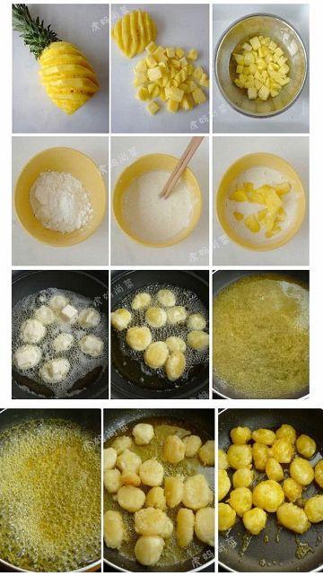 材料:菠萝半吃只,玉米淀粉20克,面粉40克,无铝泡打粉3克,白砂糖10克,清水50克,食用油适量