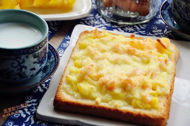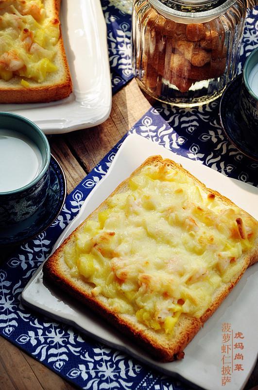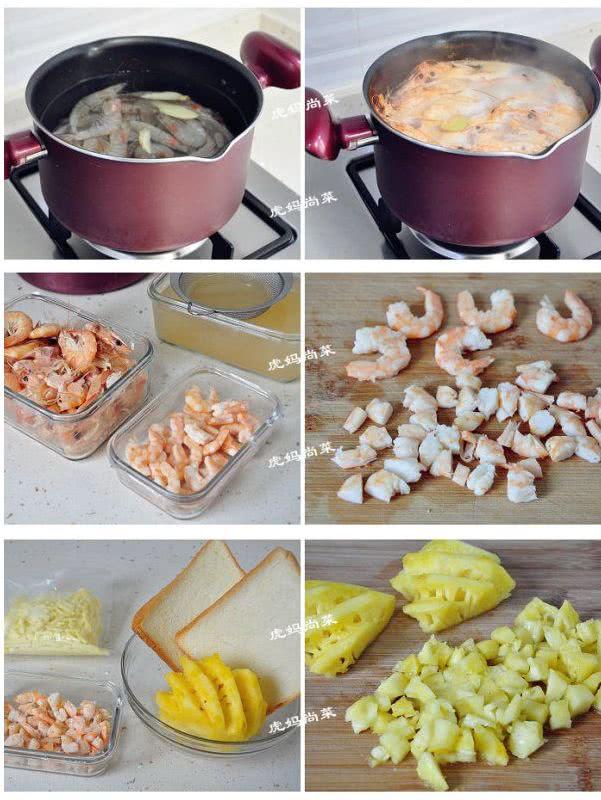 材料:土司面包2片,菠萝4/1个,海虾12个,奶酪丝1小碗。