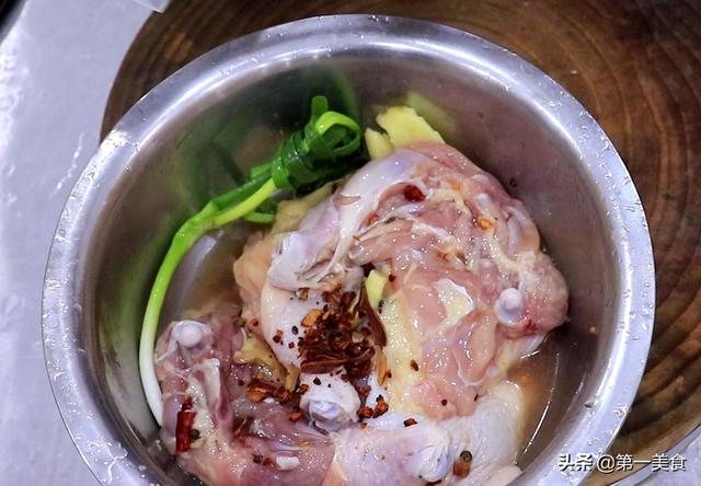 准备小葱两根,挽成结,生姜几个拍散,和鸡腿放在一起,再抓入一小撮花椒,几粒干辣椒,倒入一点料酒去腥 ,加入一勺食盐,抓拌均匀腌制10分钟给鸡肉码味。