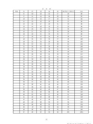 本测验每答对一题计1分,相加得到总分,总分还要转换为智商,才能真正知道你的智力水平,下面的计分标即有此作用。在你的年龄那一列中找到你的题目得分,对应的最右边一列的数值即是你的智商(I.Q)。例如,如果你是20岁,答对40道题,那么你在20岁这一列中找到40,右侧即是你的智商122。