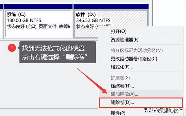 步骤2:点击磁盘【磁盘管理】,右键选择要格式化显示格式化硬盘的【删除卷】;